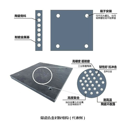 熔瓷耐磨襯板由耐磨陶瓷骨料和高韌金屬基構(gòu)成,巧妙的強(qiáng)化了成分材料的各自優(yōu)點,避開了各自的弱點,解決了陶瓷耐磨不抗沖擊,金屬有韌性而不耐磨的組合難題。